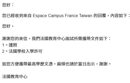 但我後來其實還是維持使用法文面試,雖然前期準備緊張很多,但我自己覺得,我到時候到那裏也是法文上課,所以這也只是其中一步而已,也讓我有一個短期目標,莫名的比較有動力繼續認真學法文。